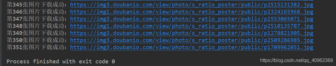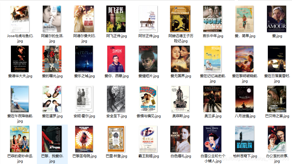 class douban_love_moives():def __init__(self, k):self.k = kdef load_moive(self, start):url = 'https://movie.douban.com/j/chart/top_list?type=13&interval_id=100%3A90&action=&start=' + str(start) + '&limit=20'time.sleep(random.randint(1, 4))rsp = request.urlopen(url)json_data = json.loads(rsp.read().decode())for moive in json_data:self.k += 1time.sleep(random.randint(2, 5))try:request.urlretrieve(moive['cover_url'], 'F:\文件存放处\爱情片电影封面\\' + moive['title'] + '.jpg')print('第' + str(self.k) + '张图片下载成功:' + moive['cover_url'])except Exception:print('第' + str(self.k) + '张图片下载失败:' + moive['cover_url'])def get_moives(self):for start in range(0, 351, 20):# 使用代理步骤# - 1、设置代理地址proxys = [{'http': '39.137.69.10:8080'},{'http': '60.255.186.169:8888'},{'http': '117.191.11.108:80'}]# - 2、创建ProxyHandlerproxy = random.choice(proxys)proxy_handler = request.ProxyHandler(proxy)# - 3、创建Openeropener = request.build_opener(proxy_handler)# - 4、导入Openerrequest.install_opener(opener)self.load_moive(self.k)if __name__ == '__main__':print('开始下载图片......')moive = douban_love_moives(k=0)moive.get_moives()