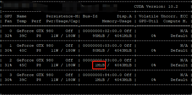 因为我使用的是2号GPU,当我的程序一运行,可以看到2号GPU的占用内存从1MiB一直飙升,直至接近4043MiB,然后就报错上面的RuntimeError