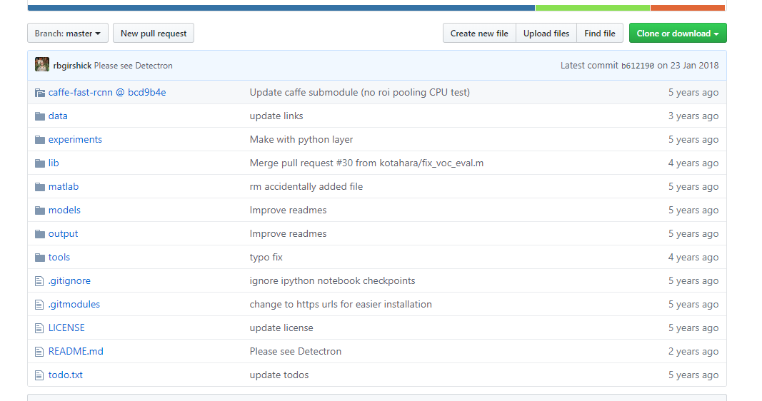 如果只需要下载totd.txt这个文件,点开这个文件,复制该页面的网址得到https://github.com/rbgirshick/fast-rcnn/blob/master/todo.txt,同样的,把blob/master改为trunk得到https://github.com/rbgirshick/fast-rcnn/trunk/todo.txt,用同样的方法即可单独下载该文件