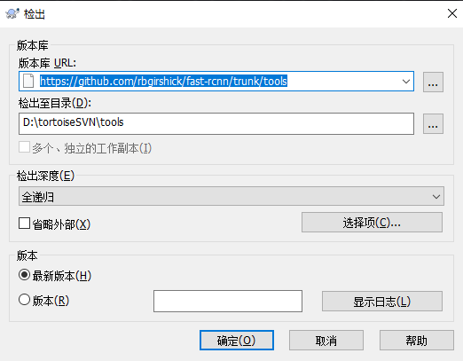 将tree/master改为trunk,得到https://github.com/rbgirshick/fast-rcnn/trunk/tools,再桌面右键,选择SVN检出,在弹出的窗口中输入修改后的网址,点击确定,即可下载该文件夹