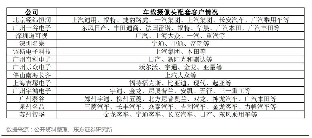 目前国内车载摄像头供应商相较于国外公司整体实力仍较弱。部分非上市公司是车载摄像头的供应商,其中包括北京经纬恒润、广州一谷电子等公司。这些公司客户以合资和自主品牌整车厂为主,其中北京经纬恒润的客户包括上汽通用、一汽集团、上汽集团、长安汽车、广汽乘用车等,广州一谷电子的客户包括东风日产、广汽本田、广汽丰田等。