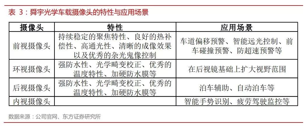 舜宇光学是全球领先的车载摄像头供应商。公司于 2004 年进入车载摄像头领域,2012 年起出货量开始稳居全球第一位。舜宇光学的车载摄像头产品包括前视摄像头、环视镜头、后视镜头、内视镜头等,其产品具有持续稳定的聚焦特性、良好的热补偿性、高通光性等优良的特性,可以广泛应用于各种自动驾驶场景。