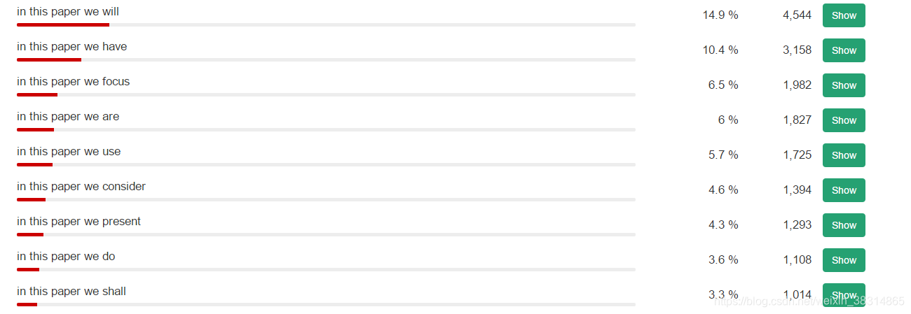例如,搜索in this paper we _(注意星号前需要有空格),得到(词组使用频率多少以红色线的长短表示)