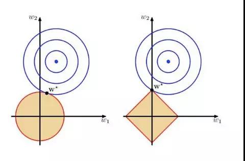 上图中的模型是线性回归,有两个特征,要优化的参数分别是w1和w2,左图的正则化是L2,右图是L1。蓝色线就是优化过程中遇到的等高线,一圈代表一个目标函数值,圆心就是样本观测值(假设一个样本),半径就是误差值,受限条件就是红色边界(就是正则化那部分),二者相交处,才是最优参数。可见右边的最优参数只可能在坐标轴上,所以就会出现0权重参数,使得模型稀疏。