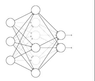 然后按照BP学习算法对ANN中的参数进行学习更新(虚线连接的单元不更新,因为认为这些神经元被临时删除了)。这样一次迭代更新便完成了。下一次迭代中,同样随机删除一些神经元,与上次不一样,做随机选择。这样一直进行瑕疵,直至训练结束。