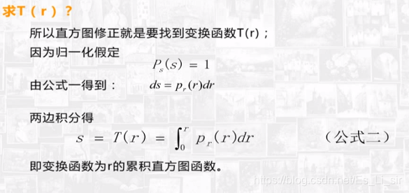 假设用r表示归一化的原图像灰度;用s表示经过直方图修正后的图像灰度。即0<=r,s<=1 在[0,1]区间内的任一个r值,都可产生一个s值,且