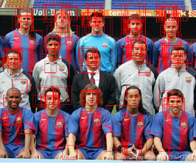 在人脸识别中,一张脸会出现非常多的窗口,如下图所示: