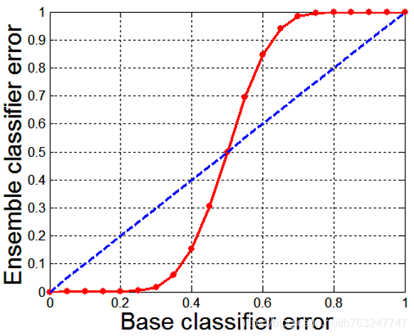 下图显示了,弱分类器(有的文档也称base classifier)的错误率(做出错误预测的概率)与集成分类器(ensemble classifier)的错误率之间的关系