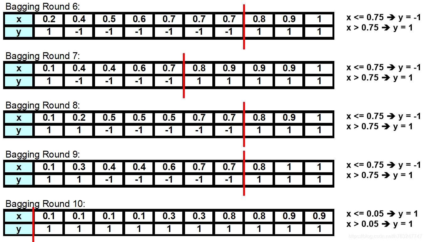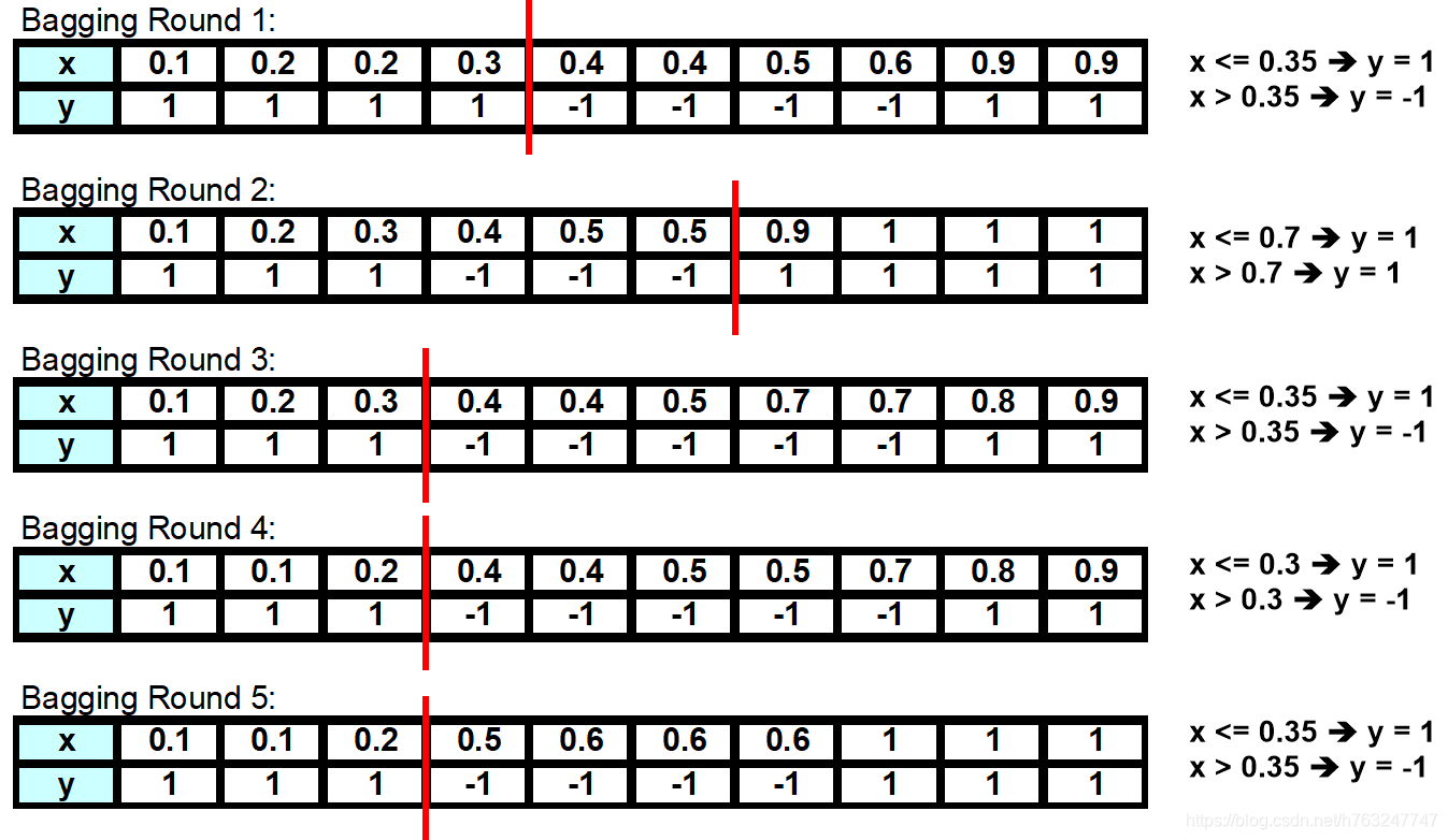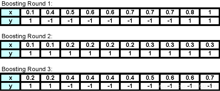 在以后的几轮抽取中,被抽取的权重发生变化,错误分类的数据的被抽取的权重将会提升,