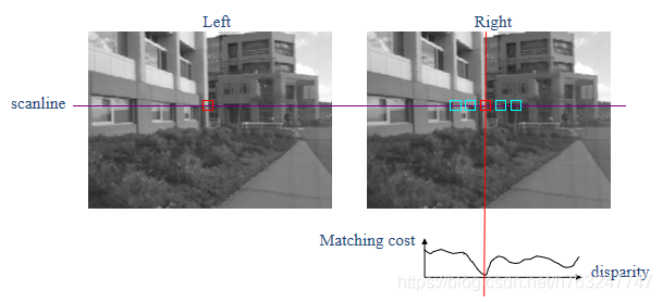 选定一个窗口,沿着极线滑动,与左图窗口比较,计算matching cost, 确定相似度(比如SSD)