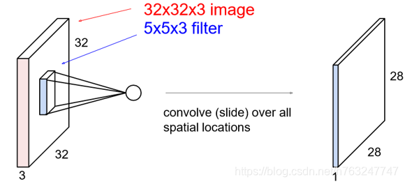 假设一张图像32*32*3(3为RGB颜色通道),滤波器为5*5*3,卷积后得到特征图像(28*28*1),这里默认stride 为1。