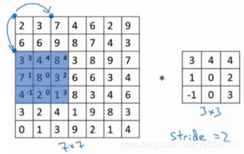如果步长为2,滤波器每隔两个像素点移动,如下图所示。