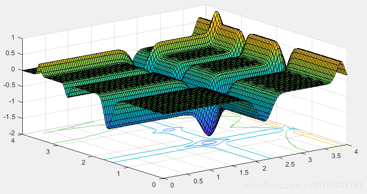 surfc(x,y,z);把矩阵x,y代入f函数中,画出图形。