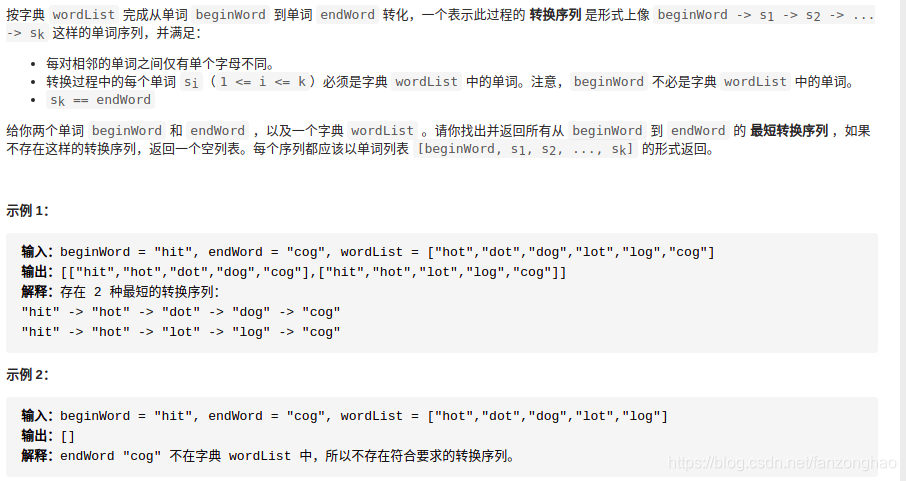 class Solution:def findLadders(self, beginWord: str, endWord: str, wordList: List[str]) -> List[List[str]]:cost = {}for word in wordList:cost[word] = float("inf")cost[beginWord] = 0# print('==cost:', cost)# neighbors = collections.defaultdict(list)neighbors = {}ans = []#构建图for word in wordList:for i in range(len(word)):key = word[:i] + "*" + word[i + 1:]if key not in neighbors:neighbors[key] = []neighbors[key].append(word)else:neighbors[key].append(word)# print('==neighbors:', neighbors)q = [[beginWord]]# print('====q:', q)#bfswhile q:path = q.pop(0)# print('===path:', path)cur = path[-1]if cur == endWord:ans.append(path.copy())else:for i in range(len(cur)):new_key = cur[:i] + "*" + cur[i + 1:]if new_key not in neighbors:continuefor neighbor in neighbors[new_key]:# print('==cost[cur] + 1, cost[neighbor]:', cost[cur] + 1, cost[neighbor])if cost[cur] + 1 <= cost[neighbor]:q.append(path + [neighbor])cost[neighbor] = cost[cur] + 1# print('==ans:', ans)# print(cost)return ans