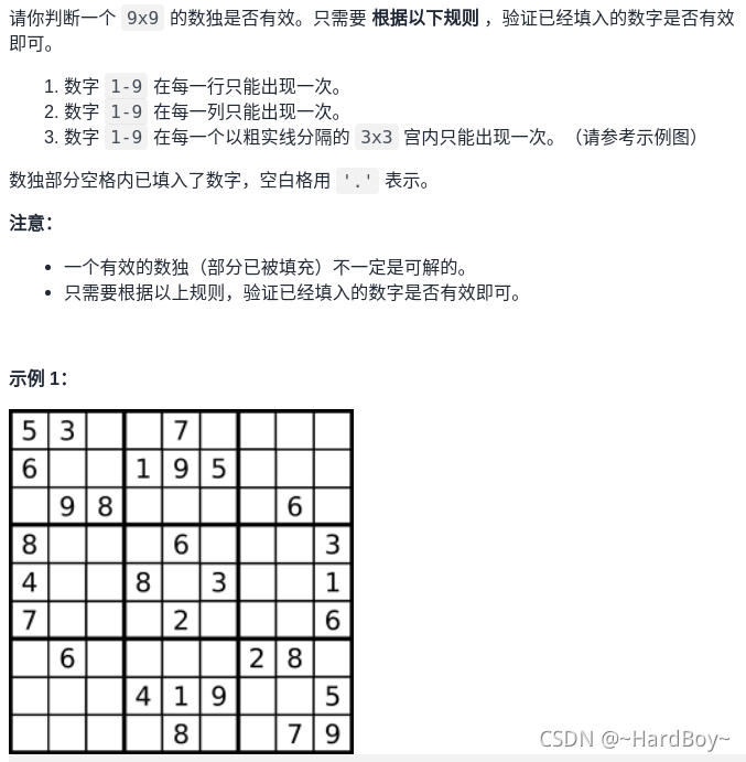 public:bool isValidSudoku(vector<vector<char>>& board) {vector<vector<int>> rows(9, vector<int>(9, 0));vector<vector<int>> cols(9, vector<int>(9, 0));vector<vector<int>> boxs(9, vector<int>(9, 0));for(int i = 0; i < 9; i++){for(int j = 0; j < 9; j++){if (board[i][j] == '.') continue;int num = board[i][j] - '1';int box_index = (i / 3) * 3 + j / 3;rows[i][num]++;cols[j][num]++;boxs[box_index][num]++;if(rows[i][num] > 1 || cols[j][num] > 1 || boxs[box_index][num] > 1){return false;}}}return true;}