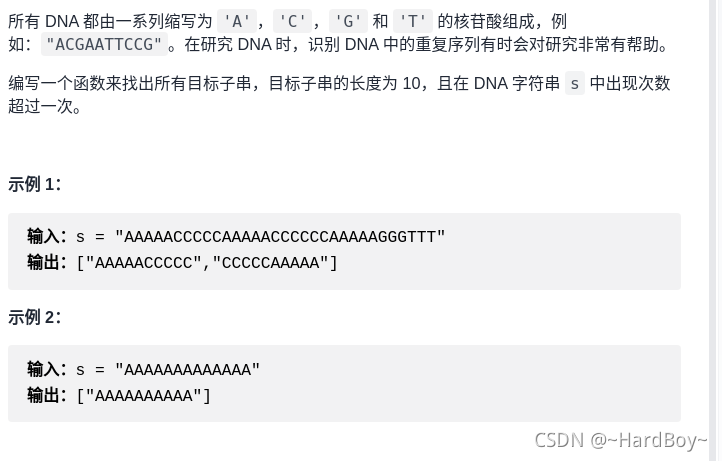 class Solution:def findRepeatedDnaSequences(self, s: str) -> List[str]:length = 10res = list()temp = dict()for i in range(len(s) - length + 1):temp[s[i:i+length]] = temp.get(s[i:i+length], 0) + 1if temp[s[i:i+length]] == 2:res.append(s[i:i+length])return res