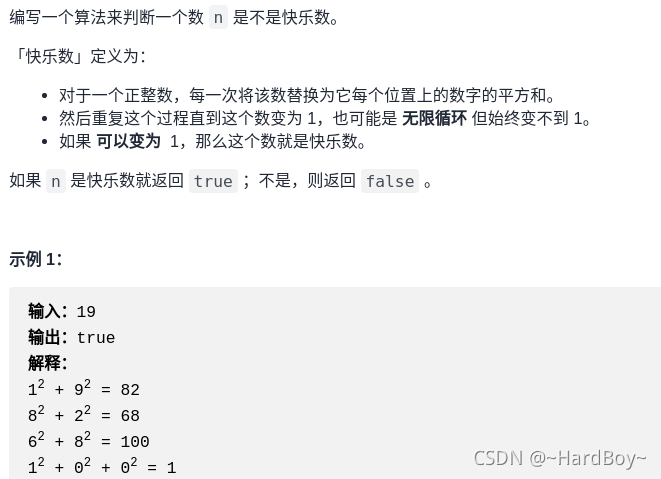 class Solution:def nextN(self, n):sum_ = 0while n > 0:digit = n % 10n = n//10sum_ += digit**2return sum_def isHappy(self, n: int) -> bool:visit = set()while n!=1 and n not in visit:visit.add(n)n = self.nextN(n)return n==1