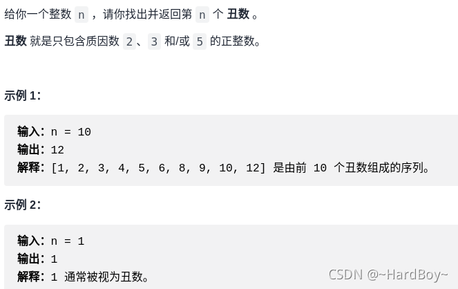 public:int nthUglyNumber(int n) {vector<int>dp(n, 1);int index_two = 0, index_three = 0, index_five = 0;for(int i = 1; i < n; i++){int two = dp[index_two]*2;int three = dp[index_three]*3;int five = dp[index_five]*5;dp[i] = min(min(three, two), five);if(two == dp[i]){index_two++;}if(three == dp[i]){index_three++;}if(five == dp[i]){index_five++;}}return dp[n-1];}