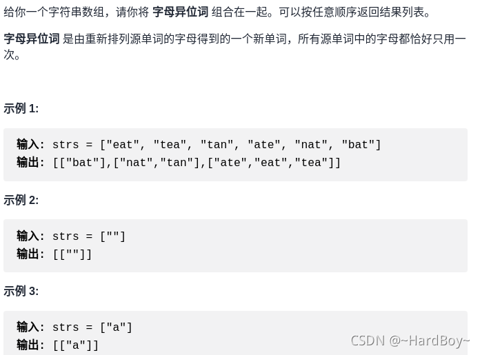 class Solution:def groupAnagrams(self, strs: List[str]) -> List[List[str]]:dict_={}for i in range(len(strs)):str_ = ''.join(sorted(strs[i]))if str_ in dict_:dict_[str_].append(strs[i])else:dict_[str_] = [strs[i]]# print(dict_.values())return list(dict_.values())