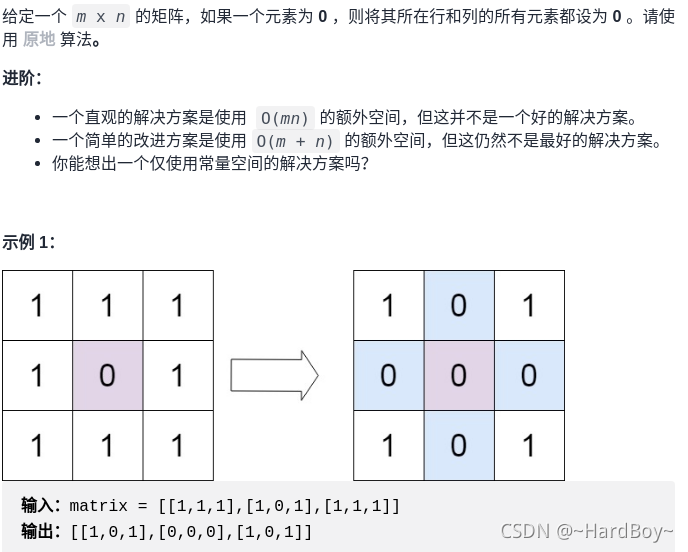 class Solution:def setZeroes(self, matrix: List[List[int]]) -> None:"""Do not return anything, modify matrix in-place instead."""m, n = len(matrix), len(matrix[0])row, col = [False] * m, [False] * nfor i in range(m):for j in range(n):if matrix[i][j] == 0:row[i] = col[j] = Truefor i in range(m):for j in range(n):if row[i] or col[j]:matrix[i][j] = 0