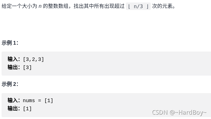 class Solution:def majorityElement(self, nums: List[int]) -> List[int]:length = len(nums) // 3 + 1dict_ = {}for num in nums:dict_[num] = dict_.get(num, 0) + 1res = []for key in dict_:if dict_[key] >= length:res.append(key)return res