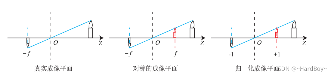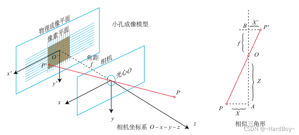 2:相机坐标系:以摄像机光心为原点(在针孔模型中也就是针孔为光心),z轴与光轴重合也就是z轴指向相机的前方(也就是与成像平面垂直),x轴与y轴的正方向与物体坐标系平行,其中上图中的f为摄像机的焦距。单位m