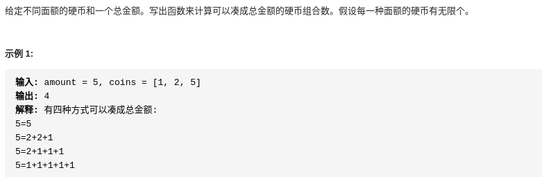 public:int change(int amount, vector<int>& coins) {int m = coins.size();vector<vector<int>> dp(m, vector<int>(amount + 1, 0));dp[0][0] = 1;for(int j = coins[0]; j < amount + 1; j += coins[0]){dp[0][j] = 1;}for(int i = 1; i < m; i++){for(int j = 0; j < amount + 1; j++){dp[i][j] = dp[i-1][j];if(j >= coins[i]){dp[i][j] += dp[i][j - coins[i]];}}}return dp[m-1][amount];}