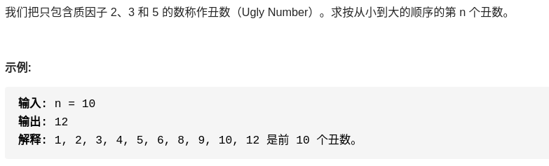 public:int nthUglyNumber(int n) {vector<int> dp(n,1);int index_two=0;int index_three=0;int index_five=0;for (int i=1;i<n;i++){int two = dp[index_two]*2;int three = dp[index_three]*3;int five = dp[index_five]*5;dp[i] = min(min(two, three), five);if (dp[i]==two){index_two++;}if (dp[i]==three){index_three++;}if (dp[i]==five){index_five++;}}return dp[n-1];}