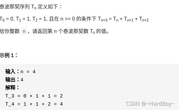 public:int tribonacci(int n) {if(n == 0){return 0;}if(n <= 2){return 1;}vector<int> dp(n + 1, 0);dp[1] = 1;dp[2] = 1;for(int i = 3; i < n+1; i++){dp[i] = dp[i-3] + dp[i-2] + dp[i-1];}return dp[n];}