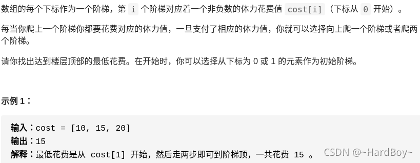 class Solution:def minCostClimbingStairs(self, cost: List[int]) -> int:dp = [0]*len(cost)dp[0],dp[1] =cost[0],cost[1]for i in range(2,len(cost)):dp[i] = min(dp[i-1],dp[i-2])+cost[i]return min(dp[-1],dp[-2])