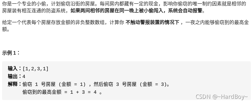 class Solution:def rob(self, nums: List[int]) -> int:n = len(nums)if n < 2:return max(nums)dp = [0] * ndp[0] = nums[0]dp[1] = max(nums[1],nums[0])for i in range(2, n):dp[i] = max(dp[i-2]+nums[i], dp[i-1])return dp[-1]