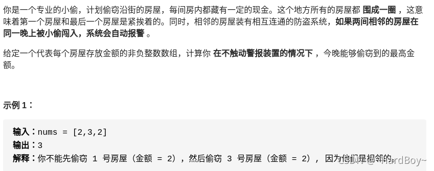 class Solution:def rob(self, nums: List[int]) -> int:n = len(nums)if n < 2:return max(nums)dp1 = [0]*ndp2 = [0]*ndp1[0] = 0dp1[1] = nums[1]dp2[0] = nums[0]dp2[1] = max(nums[0], nums[1])for i in range(2, n):dp1[i] = max(dp1[i-2]+nums[i], dp1[i-1])for i in range(2, n-1):dp2[i] = max(dp2[i-2]+nums[i], dp2[i-1])return max(dp1[-1], dp2[-2])