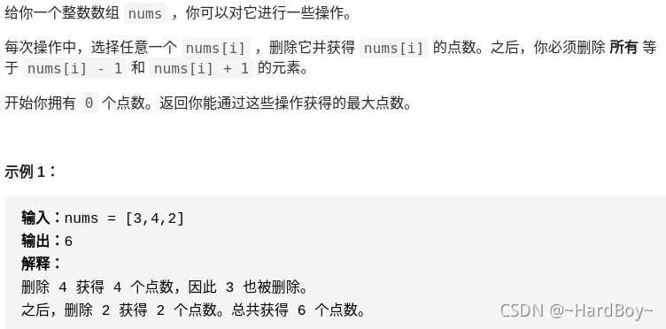 class Solution:def deleteAndEarn(self, nums: List[int]) -> int:maxVal = max(nums)total = [0] * (maxVal + 1)for val in nums:total[val] += val# print(total)n = len(total)dp = [0]*nif n <=2:return max(total)dp[0] = total[0]dp[1] = max(total[0], total[1])for i in range(2, n):dp[i] = max(dp[i-1], dp[i-2] + total[i])return dp[-1]