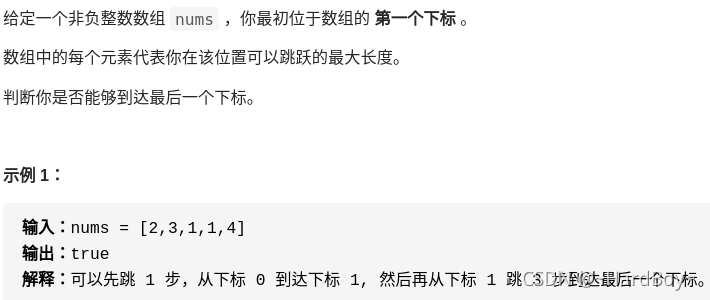 public:bool canJump(vector<int>& nums) {int most_length = 0;for(int i = 0; i < nums.size(); i++){if(i <= most_length){most_length = max(nums[i] + i, most_length);}if(most_length >= nums.size() - 1){return true;}}return false;int n = nums.size();vector<bool> opt(n, false);opt[0] = true;for(int i = 1; i < n; i++){opt[i] = opt[i - 1] && nums[i-1] >= 1;nums[i] = max(nums[i - 1] - 1, nums[i]);}return opt[n-1];}