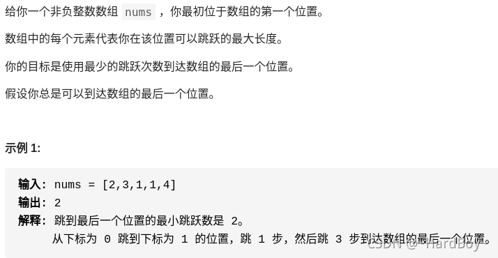 public:int jump(vector<int>& nums) {int res = 0;int start = 0;int end = 1;int maxPos = 0;while(end < nums.size()){for(int i = start; i < end; i++){//能跳到的最远距离maxPos = max(maxPos, nums[i] + i);}start = end;//下一次起跳点范围开始的格子end = maxPos + 1;//下一次起跳点范围结束的格子res++;}return res;}