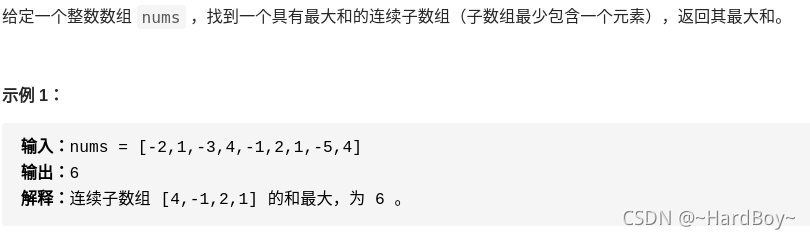 class Solution:def maxSubArray(self, nums: List[int]) -> int:for i in range(1,len(nums)):nums[i]+=max(nums[i-1],0)return max(nums)