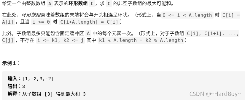 public:int maxSubarraySumCircular(vector<int>& nums) {int sum_ = nums[0];vector<int>dpmax(nums);vector<int>dpmin(nums);for(int i=1;i<nums.size();i++){dpmax[i]=max(dpmax[i-1]+nums[i],nums[i]);dpmin[i]=min(dpmin[i-1]+nums[i],nums[i]);sum_ += nums[i];}int maxv=*max_element(dpmax.begin(),dpmax.end());int minv=*min_element(dpmin.begin(),dpmin.end());if(sum_ - minv == 0 ){return maxv;}else{return max(maxv, sum_ - minv);}}
