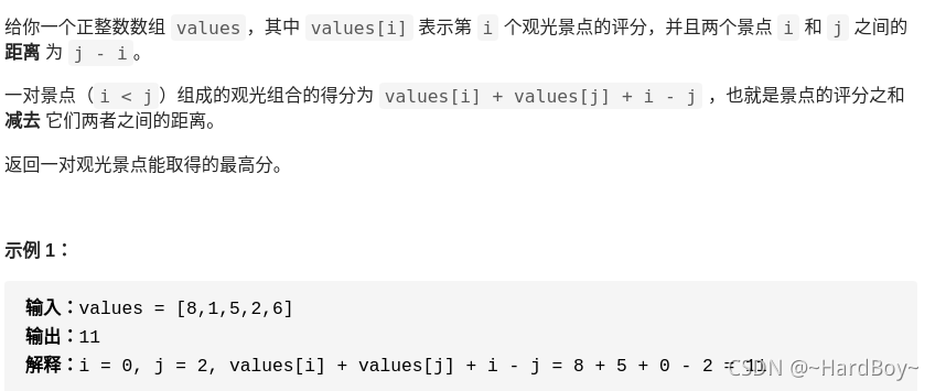 public:int maxScoreSightseeingPair(vector<int>& values) {int n = values.size();int mx = values[0];int max_score = INT_MIN;for(int i = 1; i < n; i++){max_score = max(max_score, mx + values[i] - i);mx = max(mx, values[i] + i);}return max_score;}