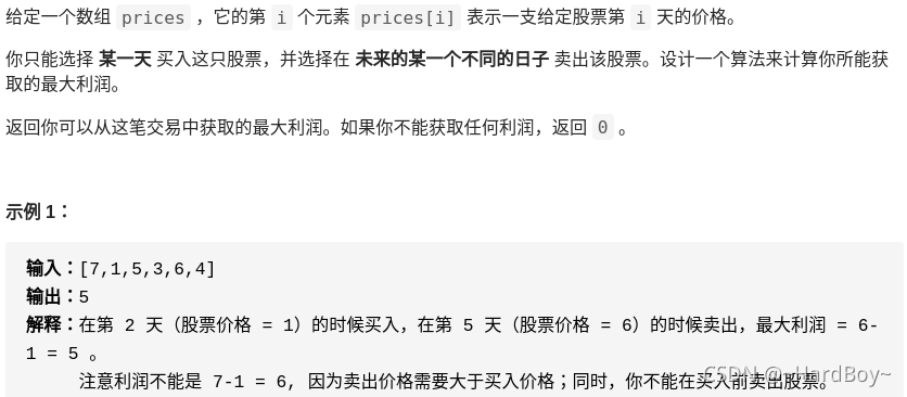 class Solution:def maxProfit(self, prices: List[int]) -> int:if len(prices) <= 1:return 0min_price = prices[0]max_profit = 0for i in range(1, len(prices)):min_price = min(prices[i], min_price)max_profit = max(max_profit, prices[i] - min_price)return max_profit