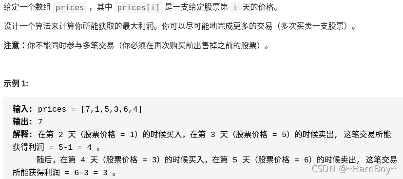 public:int maxProfit(vector<int>& prices) {int n = prices.size();if(n <= 1){return 0;}int res = 0;for(int i = 1; i < n; i++){res += max(0, prices[i] - prices[i-1]);}return res;}