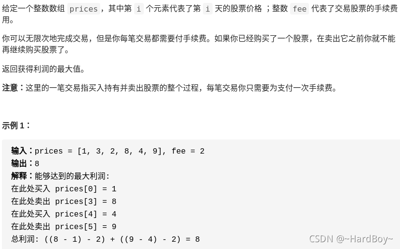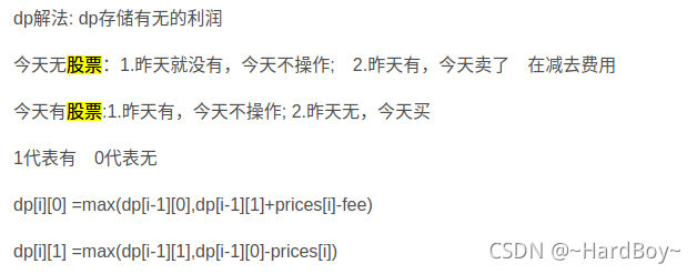 class Solution:def maxProfit(self, prices: List[int], fee: int) -> int:dp = [[0 for i in range(2)] for i in range(len(prices))]dp[0][1] = -prices[0]for i in range(1, len(prices)):dp[i][0] = max(dp[i - 1][0], dp[i - 1][1] + prices[i] - fee)dp[i][1] = max(dp[i-1][1], dp[i-1][0]-prices[i])# print('==dp:', dp)return dp[-1][0]