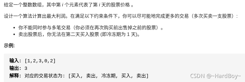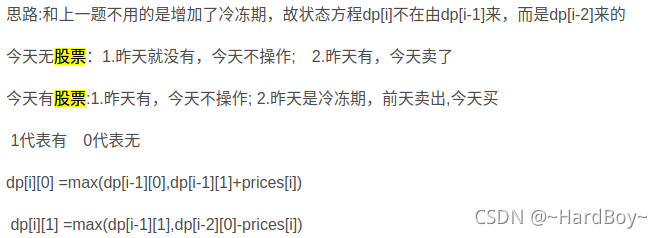 class Solution:def maxProfit(self, prices: List[int]) -> int: if len(prices)<=1:return 0 dp = [[0 for i in range(2)] for i in range(len(prices))]# print('==dp:', dp)dp[0][1] = -prices[0]dp[1][0] = max(dp[1 - 1][0], dp[1 - 1][1] + prices[1])dp[1][1] = max(dp[1-1][1], -prices[1])for i in range(2, len(prices)):dp[i][0] = max(dp[i - 1][0], dp[i - 1][1] + prices[i])dp[i][1] = max(dp[i - 1][1], dp[i - 2][0] - prices[i])# print('==dp:', dp)return dp[-1][0]#返回没有的最大利润