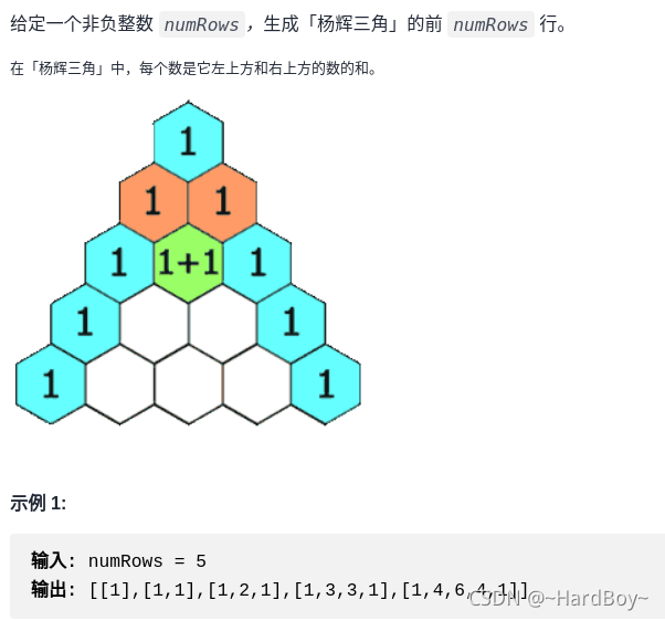 class Solution:def generate(self, numRows: int) -> List[List[int]]:res = []for i in range(numRows):temp = [0]*(i+1)for j in range(i + 1):if j == 0 or i == j:temp[j] = 1else:temp[j] = res[i-1][j] + res[i-1][j-1]res.append(temp)return res