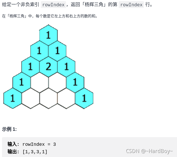 class Solution:def getRow(self, rowIndex: int) -> List[int]:res = [0]*(rowIndex+1)res[0] = 1for i in range(rowIndex + 1):for j in range(i, 0, -1):res[j] += res[j-1]return res