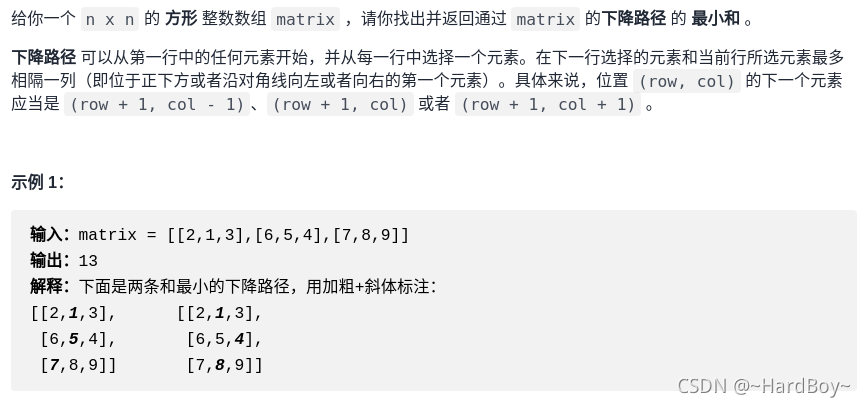 public:int minFallingPathSum(vector<vector<int>>& matrix) {//dp[i][j] = min(dp[i-1][j-1], dp[i-1][j], dp[i-1][j+1])+matrix[i][j]int n = matrix.size();vector<vector<int>> dp(n, vector<int>(n, 0));for(int i = 0; i < n; i++){dp[0][i] = matrix[0][i];}for(int i = 1; i < n; i++){for(int j = 0; j < n; j++){if(j == 0){dp[i][j] = min(dp[i-1][j], dp[i-1][j+1])+matrix[i][j];}else if(j == n-1){dp[i][j] = min(dp[i-1][j-1], dp[i-1][j])+matrix[i][j];}else{dp[i][j] = min(dp[i-1][j-1], min(dp[i-1][j], dp[i-1][j+1]))+matrix[i][j];}}}int min_value = *min_element(dp[n-1].begin(), dp[n-1].end());return min_value;}