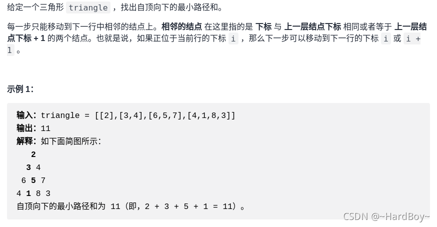 public:int minimumTotal(vector<vector<int>>& triangle) {int h = triangle.size();for(int i = 1; i < triangle.size(); i++){for(int j = 0; j < triangle[i].size(); j++){if(j == 0){triangle[i][j] = triangle[i-1][j] + triangle[i][j];}else if(j == i){triangle[i][j] = triangle[i-1][j-1] + triangle[i][j];}else{triangle[i][j] = min(triangle[i-1][j-1], triangle[i-1][j]) + triangle[i][j];}}}int min_value = *min_element(triangle[h - 1].begin(), triangle[h - 1].end());return min_value;}