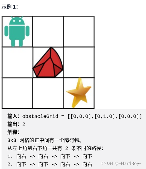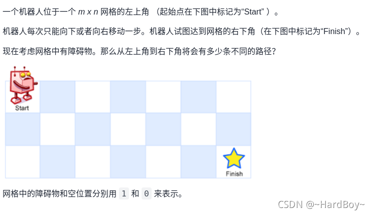 public:int uniquePathsWithObstacles(vector<vector<int>>& obstacleGrid) {int m = obstacleGrid.size();int n = obstacleGrid[0].size();vector<vector<int>> dp(m, vector<int>(n, 0));if(obstacleGrid[0][0] == 1){return 0;}dp[0][0] = 1;for(int i = 1; i < m; i++){if(dp[i-1][0]==1 && obstacleGrid[i][0] != 1){dp[i][0] = 1;} }for(int j = 1; j < n; j++){if(dp[0][j-1] == 1 && obstacleGrid[0][j] != 1){dp[0][j] = 1;} }for(int i = 1; i < m; i++){for(int j = 1; j < n; j++){if(obstacleGrid[i][j] != 1){dp[i][j] = dp[i-1][j] + dp[i][j-1];}}}return dp[m-1][n-1];}