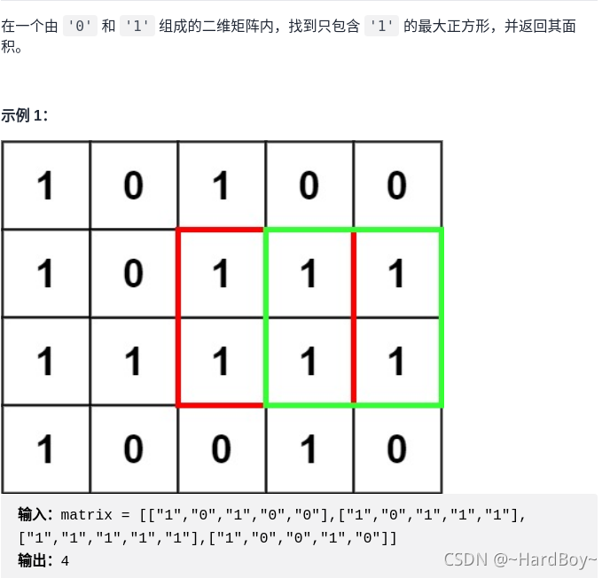 class Solution:def maximalSquare(self, matrix: List[List[str]]) -> int:h = len(matrix)w = len(matrix[0])dp = [[0 for j in range(w)] for i in range(h)]dp[0][0] = int(matrix[0][0])maxside = int(matrix[0][0])for i in range(1, h):dp[i][0] = int(matrix[i][0])maxside = max(maxside, dp[i][0]) for j in range(1, w):dp[0][j] = int(matrix[0][j])maxside = max(maxside, dp[0][j])for i in range(1, h):for j in range(1, w):if matrix[i][j] == '1':dp[i][j] = min(dp[i-1][j], dp[i-1][j-1], dp[i][j-1]) + 1 maxside = max(maxside, dp[i][j])return maxside**2