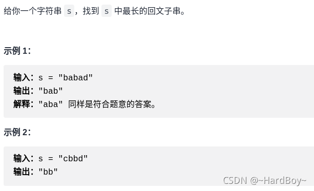 public:string res;void help(string s, int left, int right){while(left>=0 && right<s.size() && s[left]==s[right]){left--;right++;}left++;right--;if((right - left + 1) > res.size()){res = s.substr(left, right - left + 1); }}string longestPalindrome(string s) {if(s.size()<=1){return s;}for(int i=0; i<s.size(); i++){help(s, i, i);help(s, i, i+1);}return res;}