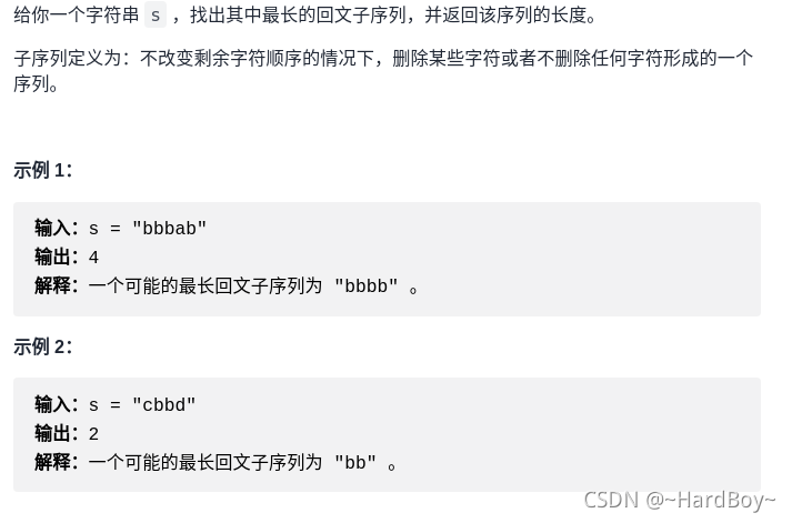 class Solution:def longestPalindromeSubseq(self, s: str) -> int:n = len(s)dp = [[0] * n for _ in range(n)]for i in range(n - 1, -1, -1):dp[i][i] = 1for j in range(i + 1, n):if s[i] == s[j]:dp[i][j] = dp[i + 1][j - 1] + 2else:dp[i][j] = max(dp[i + 1][j], dp[i][j - 1])return dp[0][n - 1]